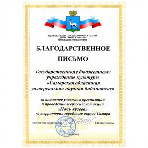За организацию и проведение мероприятия библиотека награждена благодарственным письмом Департамета культуры администрации г.о. Самары.