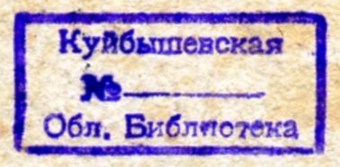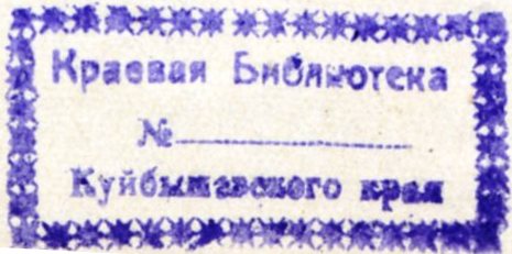 Штемпель: прямоугольный, 7 х 36, в фигурной рамке Надпись: Краевая библиотека / № / Куйбышевского края |