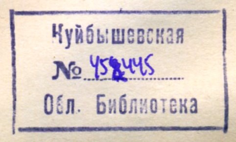 Штемпель: прямоугольный, 12 х 54, в линейной рамке Надпись: Куйбышевская областная / библиотека им. В. И. Ленина |