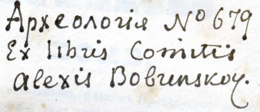 Книжный знак: 30 х 70, рукописный (чернила), шрифтовой. Надпись: «Археологiя № 679 / Ex libris comtеs / Alexis Bobrinskoy» |