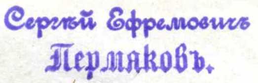 Штемпель: без рамки, 12 х 41, шрифтовой. Надпись : «Сергей Ефремович / Пермяков» |