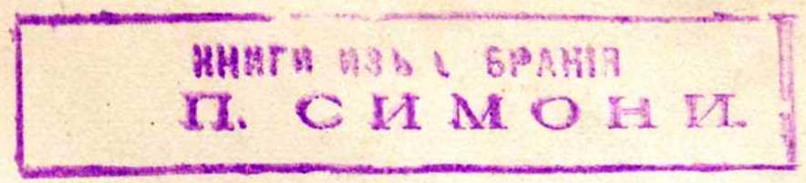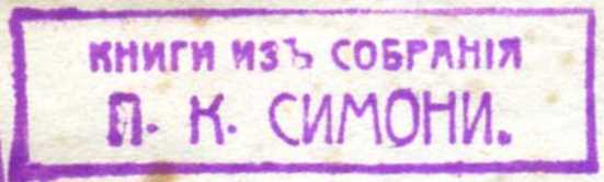 Штемпель мемориальный: прямоугольный, 14 х 70, в линейной рамке. Надпись: «Книги из собрания / П. Симони» |