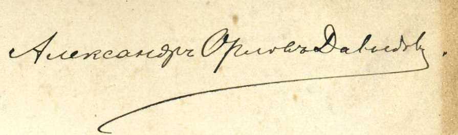 Книжный знак: 7 х 68, рукописный (чернила), шрифтовой. Надпись: Александр Орлов Давыдов |